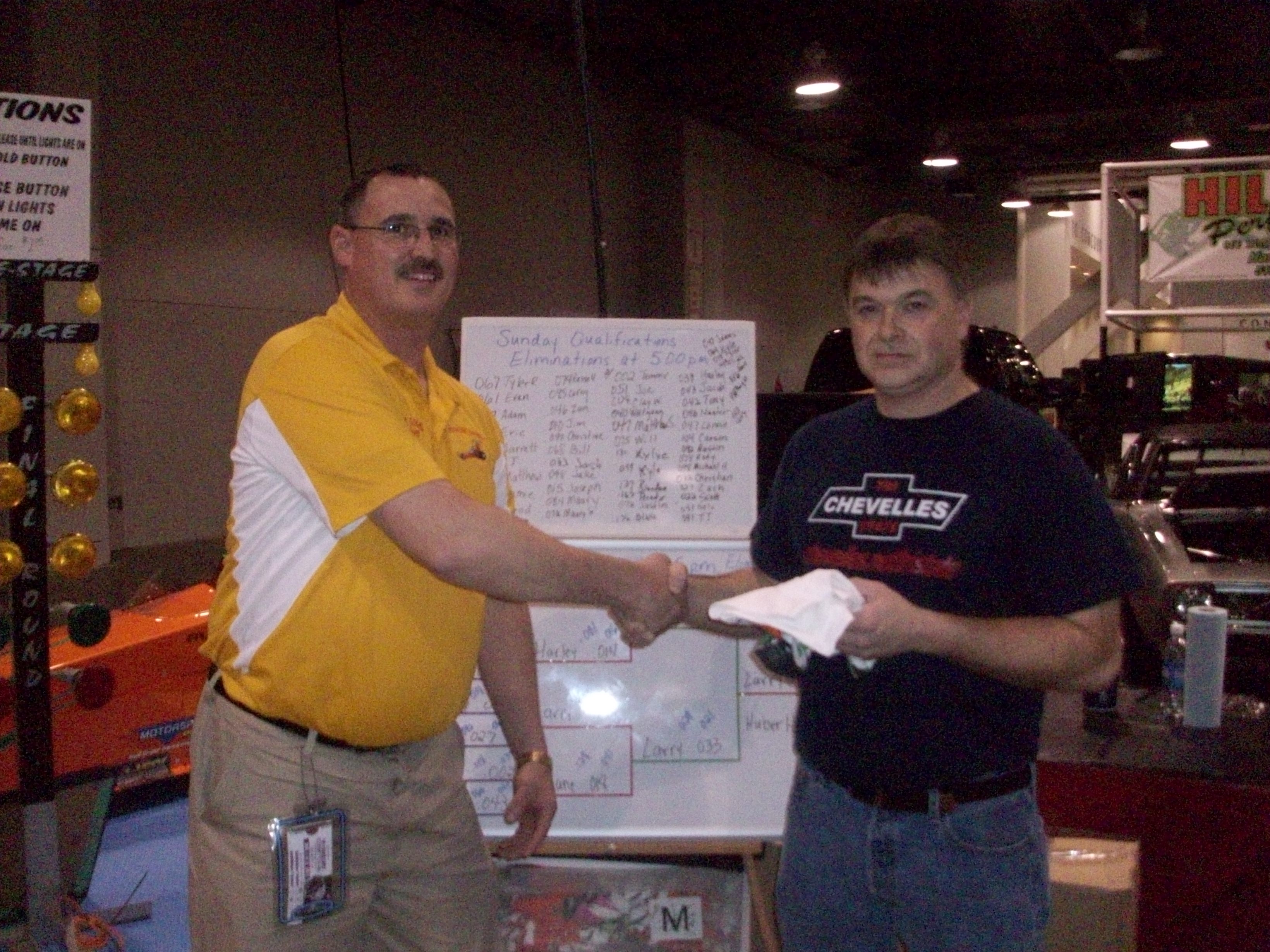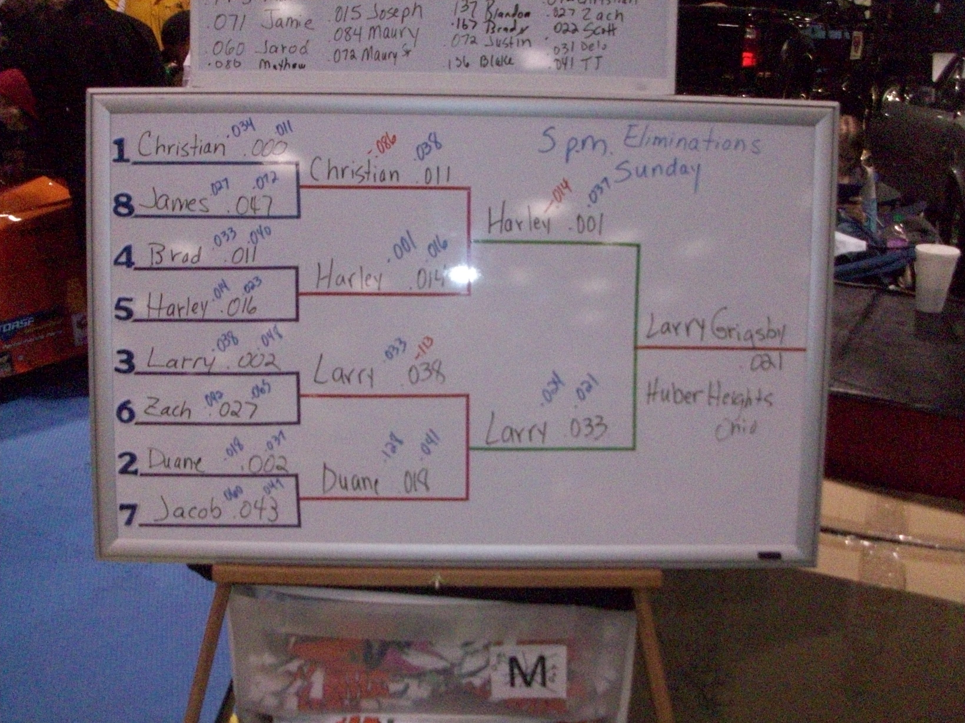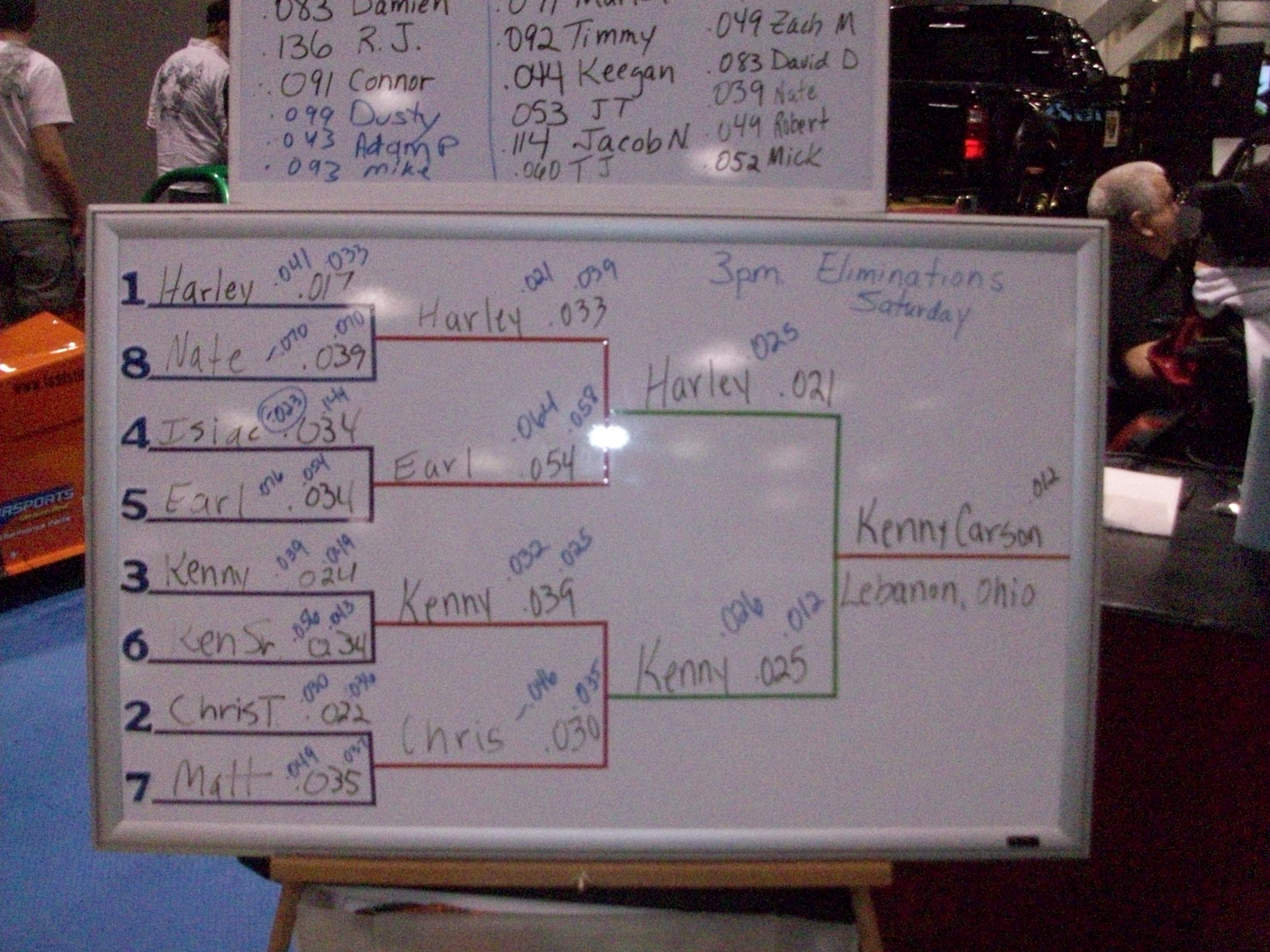 Cold weather didn't hold back the hot reaction times at this year's 51st KOI Auto Parts Cavalcade of Customs World of Wheels in Cincinnati, OH. The Motorsports Unlimited Performance Parts, Davison Service, Mean Machine Race Cars, Lang's Body Shop & Painting, APT Powder Coating, Garzolini Hybrids, Lidy Graphics and Edelbrock dragster and simulator were a huge hit with the thousands of spectators and race fans. We set up 4 reaction time races in the simulator; 1 Friday race, 2 Saturday races and 1 Sunday race. Everyone who sat in the simulator got a chance at qualifying and you would have thought they were trying to get in the field at the US Nationals. The bump spots were nearly unheard of with lots of lights in the double 0 range when a perfect light is .000 On Friday, the lights weren't double 0's but the competition was still tough; Bob Likens from Dayton, OH was the number 1 qualifier with a .019 and went on to win the race beating Renwick Coley who qualified number 2 with a 028. Coley gave Likens a good race in the final posting a .038 light, but Likens came back with an .022 for the win. Our other Qualifiers were #3 Raleigh .030, #4 Jeff Patton .039, #5 Jeff Stillabower .056, #6 Jacob Smith .059, #7 Alvin James .070 and #8 Matt Schuh .076. Saturday's 3:00 race qualifying was pretty tight with .022 thousands of a seconds separating #1 from #8. One of the highlights of eliminations was the first round match between father and son, Kenny Carson, Sr. and Kenny Carson, Jr. Kenny Sr. was up first and was feeling pretty good about himself with his .013 light until Jr. stepped in the simulator and cranked off an .009 for the first round win. The final round matched up 2 guys that were no strangers to each other both Jr dragster racers that have competed against each other in the past. #3 Qualifier Kenny Carson, Jr., who qualified with a .024 lead the final round of eliminations with an .012 making it rather tough for #1 qualifier Harley Patrick, who qualified with an .017 to win that round. As the tree lit, the 6 bright yellow lights, the best Patrick could come up with was an .025 handing the win to an excited Kenny Carson, Jr. (check out you tube video). The other qualifiers were #2 Chris T .022, #4 Isiac .034, #5 Earl .034, #6Kenny Carson Sr .034, #7 Matt .035 and #8 Nate .039 What can you say about Saturday's 9:00 qualifying and race, but totally outrageous. When qualifying was over, 6 thou separated #1 from #8. You have to hand it to a bunch of racers to try and out do each other. As a competitor would get in the field, another would be right there to try and bump out another till the end result was a bump spot of .006. If you think qualifying was tough, eliminations wasn't for the weak hearted. The second round had one of the weekends 2 perfect reaction times when Michael who qualified #7 with a .005 was running King Kenny Carson, Jr., who qualified with a .005 light. Michael let go of the transbrake switch and had a awesome .011 light but the King showed everyone he was there to play when after a flash of yellow and green the display showed all zeros for a .000 perfect reaction time sending him to his second final round of the weekend soon after, the crowd went wild. Waiting in the shadows was #5 qualifier, Walter who made the strong field with a .003. If that wasn't good enough, Shade was .005 1st round and .008 in the 2nd round but his work was cut out for him in the final because Kenny Jr. was there for the challenge after just posting a perfect light. Shade was up first and after a blur of lights an .008 flashed on the display. King Kenny knew it was going to take an .007 to beat Shade's near perfect light. Kenny Jr. slowly staged and with the glow of the tree and the release of the button, the crowd and Kenny waited what seemed to be eternity for his .019 reaction time that just wasn't good enough for the win. Walter and his buddy's celebrated seeing the reaction time ending an exciting Saturday night race. (check out you tube video) Other Qualifiers were #1 Curtis .001, #2 Jake .002, #3 Rick .002, #4 Harley Patrick .003 and Kenny Carson Sr .006. Sunday's 5:00 qualifying had our second perfect reaction time .000 from Christian and the race was just as exciting. Christian #1 qualifier advanced to the 2nd round using a .011 to meet up with Harley Patrick #5 qualifier (.016). Harley bolted out of the gate with a 1 thou from perfect .001 reaction time. Christian new the pressure was on knowing only a perfect light could beat Patrick but his .038 was no where close to winning that round, sending Harley to his 2nd final round of the weekend. On the other side of the ladder was Larry Grigsby our #3 Qualifier (.002). Larry advanced to the final using consistency to his advantage recording lights of .038 1st round and .033 in the 2nd round. In the final, Larry was up first and the bright lights didn't hamper his performance when he improved his light in the final to a .021. Harley knew he had his work cut out for him but that he had .020 thousands to work with and after the smoke cleared his .037 wasn't enough to give him the win. A very happy Larry Grigsby from Huber Heights, OH emerged the victor on Sunday night. Other qualifiers include #2 Jake .002, #4 Brad .011, #6 Zach .027 #7 Jacob .043 and #8 James .047 I would like thank all who participated in the Drag Eliminator Simulator reaction time race. These competitors weren't the only winners, the The Motorsports Unlimited Performance Parts, Davison Service, Mean Machine Race Cars, Lang's Body Shop & Painting, APT Powder Coating, Garzolini Hybrids, Lidy Graphics and Edelbrock dragster won 1st place in the Competition Dragster Class and took top honors winning the Outstanding Competition award competing against all the competition classes. |